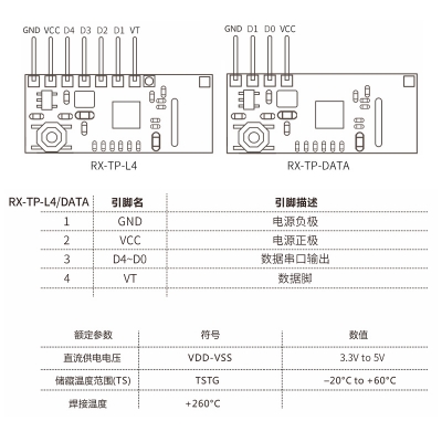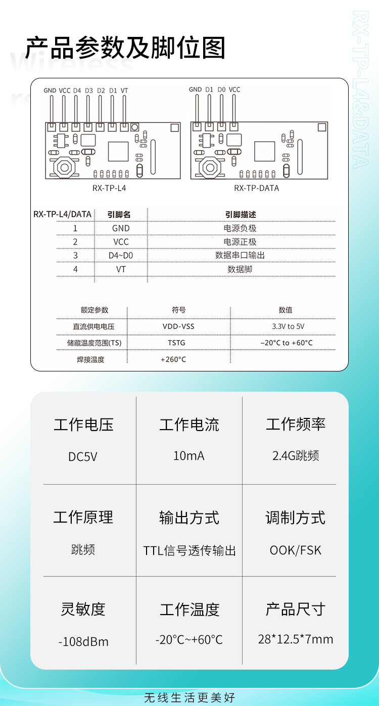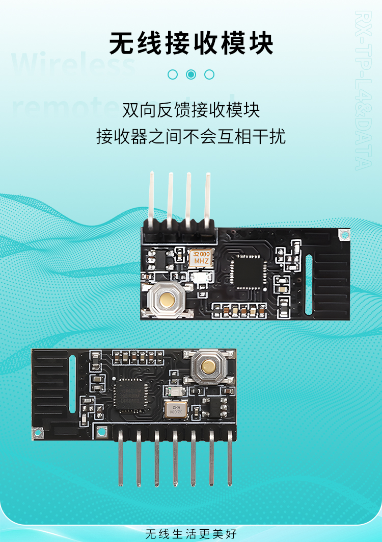RX-TP-L4/DATA是一款低功耗2.4G双向反馈跳频接收模块,抗干扰性强,不受同频干扰。主要黄瓜视频APP下载在线观看于黄瓜视频下载网址接收领域,与其他的接收模块比较,具有价格便宜、性能好、稳定等特点。
