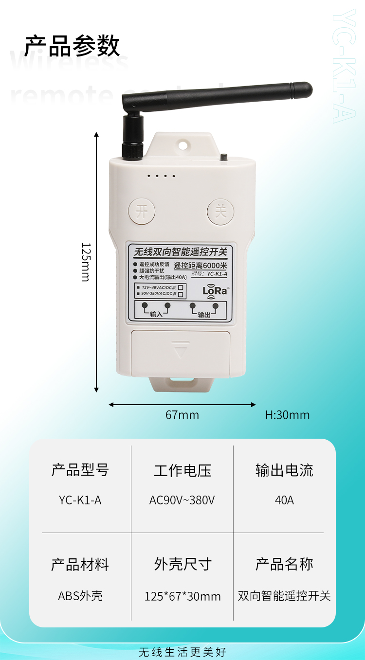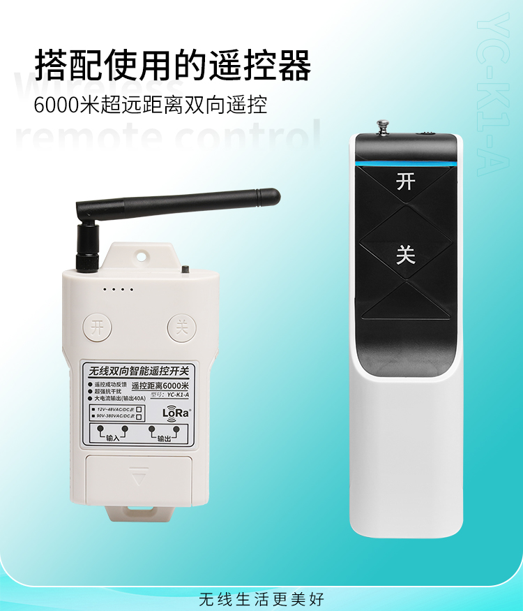 1. YC-K1-A接收器的输入电源为AC(90V-380V)DC(12V-48V),可以满足大多数客户的不同电源电压问题。2.本产品使用具有强大负载能力的大功率继电器控制输出(40A)。3.该控制器使用双向通讯。4.从6公里的距离可以清楚地知道信号的发送和接收状态。5.该控制器采用LoRaSX1278黄瓜视频下载网址双向收发芯片设计,通讯距离更长,更稳定。